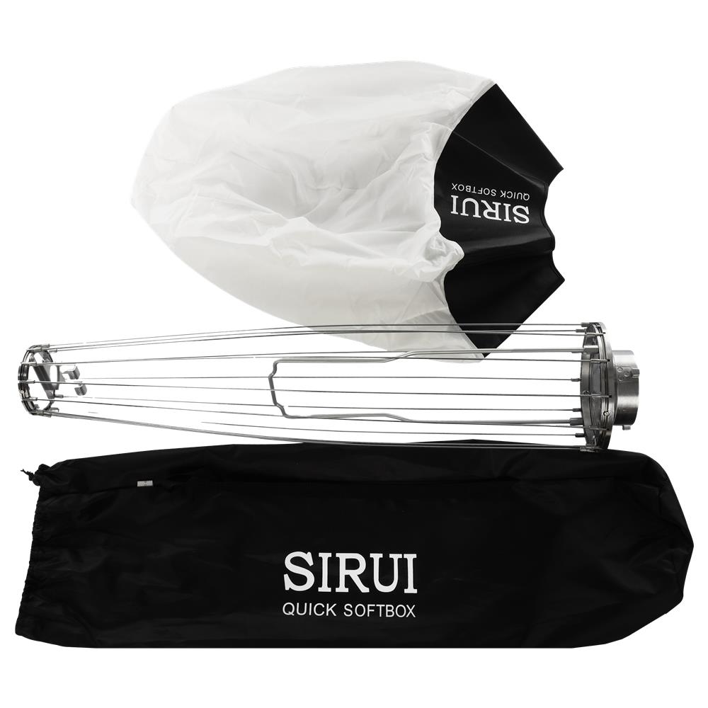 This RGQ65 softbox from Sirui helps you diffuse light. Just the way you want it. You fold it in and out easily, thanks to the special metal construction. Once unfolded, the RGQ65 softbox keeps its shape very well. And when folded, the softbox is compact to take with you. You can do that in the supplied bag. Nicely organized, together with all supplied accessories. The Bowens connection is suitable for many light sources. For example from Sirui, StudioKing and Linkstar.